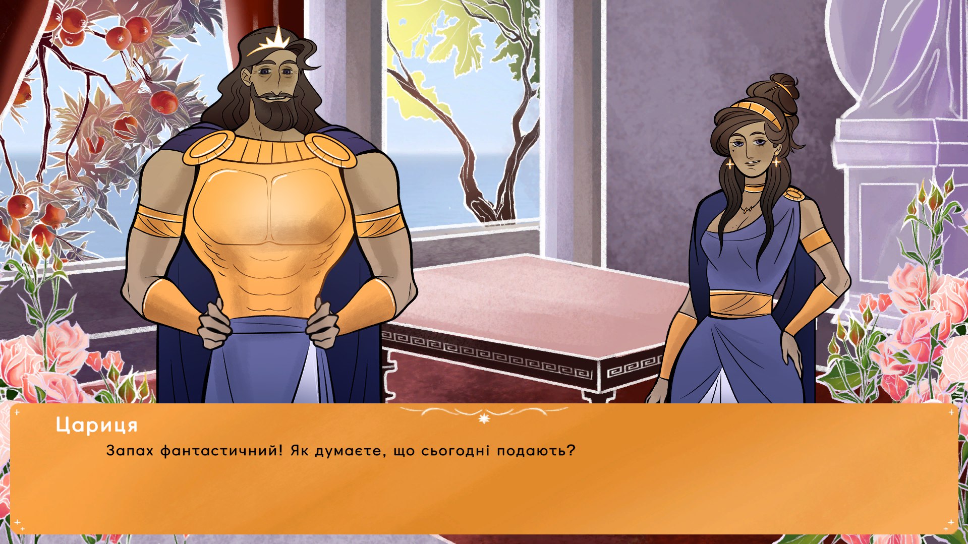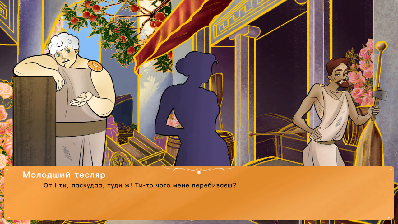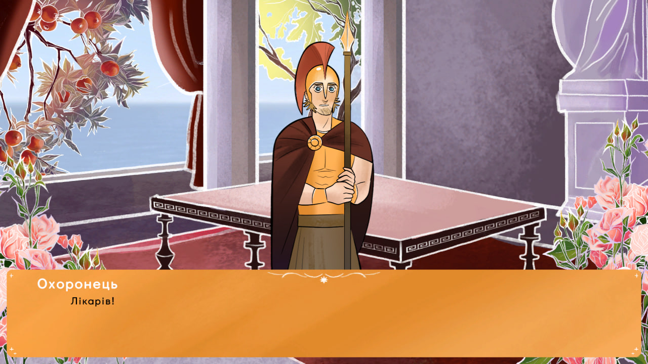 Сюжет наче - на перший погляд - доволі простий, темі відповідає повністю, і відчувається закінченим) Як вже сказала, він відчувся мені казкою. Квазі-давньогрецьке суспільство не задумується як історичне, а скоріше передає свою функцію показати атмосферу короліства, пліток та неспокою, і робить це чудово. Дівчата-пліткарки біля квітів захопили моє серце) (Далі буде трохи про кінцівки, хто боїться спойлерів!) Вперше я пройшла на кінцівку, де принцеса чуткам повірила, і зовсім губилася, чому всі так абсурдно дозволяють статися дерев'яному коню (списала це на загальну казковість та на те, що батько трошки хімбо), але подумала, що в кінці просто кліфхенгер; другий раз спочатку не хотіла проходити, бо на юніті це складніше, але щось мені підказувало, що буде твіст, і я не помилялася хд Пліткам вірити, звичайно, не найкраще, але делегація теж молодці, отаке чудити! В них же Троя це мабуть ну зовсім нещодавна подія, а вони оце страждають. Коротше, не так і погано принцеса зробила у першій кінцівці, заслужили трошки.