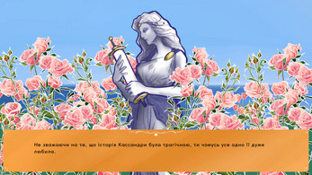 Художньо, звичайно, новела зацікавила ще на етапі сторінки, і повністю виправдала свої очікування. На фони задивлялася всю гру, страшно сподобався білий лайн, фон зі статуєю Кассандри був особливо захопливим. Спрайти дуже приємно стилістичні, як я вже сказала, з мультиковими, діснеївськими (нагадало найбільше Геркулеса) пропорціями. Батьки принцеси Дуже Гарні Люди, хоч і не сильно розумні хд. На фоні них інтерфейс простий, але з іншого боку, не відволікає від і так гарного візуалу, тому це не мінус взагаді) А про обкладинку в меню взагалі мовчу, краса та й годі